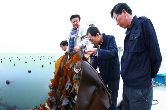 图为刘涛老师(右二)在查看爱伦湾海带的生长情况