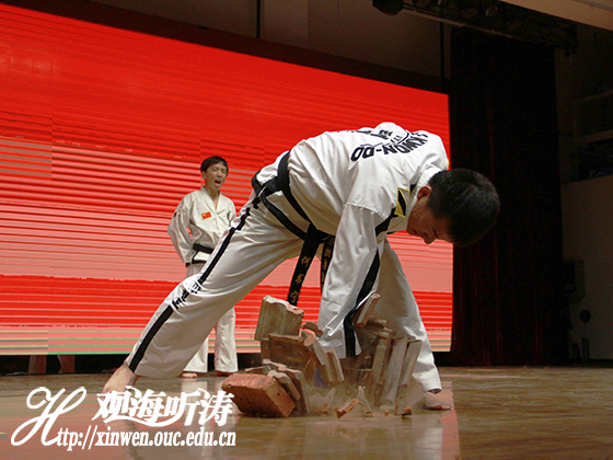 小品《我的大学》用《我的滑板鞋》的洗脑曲调,予之全新歌词,“我的OUC时尚时尚最时尚”搞笑背后却难掩对海大的缱绻深情。小品节奏轻松,同学都是本色出演,台上台下欢笑一片。表演者嬉笑怒骂,插科打诨,真实展现了大学生生活的方方面面。而最后每个人的内心独白环节,一句“再见了,海大”立马将观众情绪推向高潮。随后的舞蹈《Hi Hiphop》动感十足 ,微微稀释了刚才的悲伤,再次炒热了现场气氛。“感谢你给我的光荣,我要对你深深地鞠躬,因为付出的感动有人能懂。”经典的歌曲《光荣》则带来一种怀旧的浓浓感情。鸿轩ITF青岛馆徒手劈砖,脚踏木板,引来欢呼喝彩声阵阵,他们用扣人心弦的精彩表演送上了对毕业生的祝福。