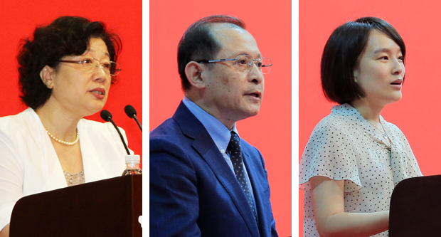 教师代表刘惠荣教授(左)、朱自强教授(中),校友代表高珊教授在开学典礼上致辞
