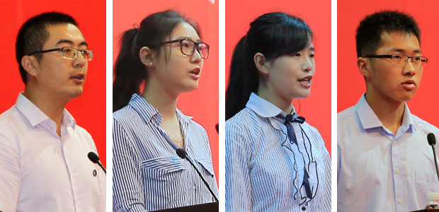 学生代表金恒(左一)、于瑶(左二)、李晓文(右二)、谢诚在开学典礼上发言