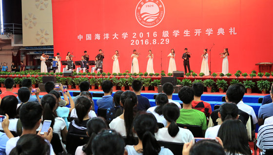 开学典礼结束后,师生们共同观看了学校宣传片——《蓝色华章》。中国海洋大学艺术系的师生们为新生奉上了一场热情欢快的迎新生音乐会,精彩的表演博得新生们的阵阵掌声。