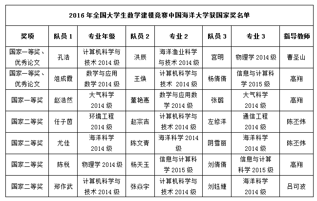 附:中国海洋大学2016年全国大学生数学建模竞赛国家奖获奖名单
