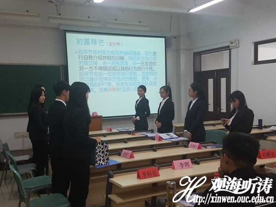 本站讯 3月30日下午,中国海洋大学第七届模拟商务谈判大赛复赛在教学区举行。本次复赛邀请到四位评委,分别是管理学院辅导员李科辰,oucpoke中心主任李晖,优秀团队代表杨雅婷,初晓宜。