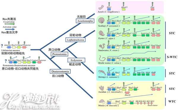 图2. Hox基因簇“分段共线性(STC)”调控新模式及其可能的起源和演化途径
