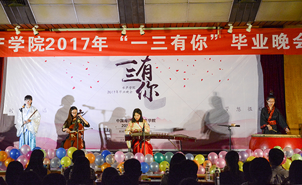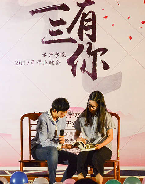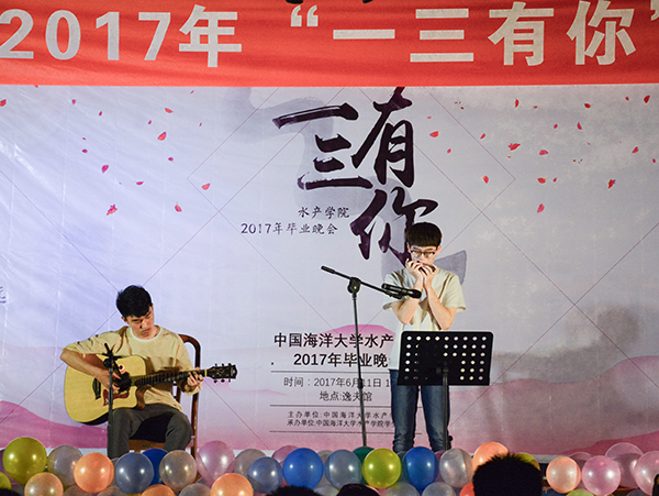 六月的云,飘过离别的愁。在鱼山路和大学路上走一走,在那见证无数真情的交叉路口稍作停留。《樱花纷飞时》,我们在此相遇,你点点头,省略了所有问候,一段行程过后,我们即将分离,挥一挥衣袖,伴着落樱的芬芳,带着梧桐的问候。由2013级水产养殖学陈成立、董华雨,2013级海洋渔业科学与技术刘俊晖带来的歌曲串烧《逆留》展示着又一代水产人砥砺前行的决心。水产学院学生会2013级宣传部全体成员带来小品《画话》,回顾同学们从加入到逐渐进步与成长的心路历程,表现了2013级宣传部成员们对这份相遇相知的难忘、对同学们的不舍、对往日工作时光的怀念、对母校的美好祝愿。最后,在2012级水产养殖学毕业生刘世杰的原创歌曲《十年有你》中,在留恋与回味中,“一三有你”水产学院2017年毕业晚会结束。