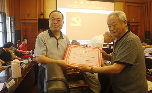 陈锐为获特殊贡献奖的党员颁发奖牌,丁林为优秀党员颁发荣誉证书。