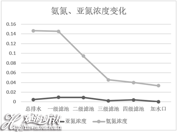 第三天,队员们则对循环水水质展开调研。亲自采取水样,并与公司水质检测部门的工作人员进行、交流学习。通过检测发现,在所选取的水样中,亚氮浓度有一定的起伏,在正常范围内;从总排水到各级生物滤池,氨氮浓度逐渐下降,一级、二级、三级、四级生物滤池对上一级氨氮的去除率依次为0.7%、34.9%、52.0%、11.8%,其中二级、三级滤池去除效果明显,经四级滤池后,氨氮去除率达到72.7%。