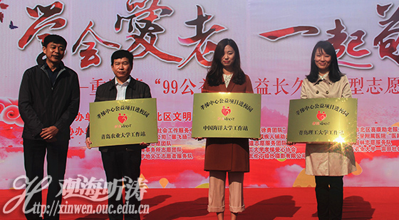 在紧接着进行的“连接人生两个节点”99公益项目启动仪式上,张婧代表中国海洋大学志愿者接收“孝悌中心进校园——中国海洋大学工作站”站牌,并进行发言,她对青岛市北文明办,孝悌中心为大学生志愿者们提供敬老志愿服务平台表示感谢,并指出通过异地大学生志愿者与空巢老人结对互助,可以让大学生们深刻感受孝文化的内涵和精神实质,进一步弘扬中华民族“爱老、孝老、养老、敬老”的传统美德和“奉献、友爱、互助、进步”的志愿精神。