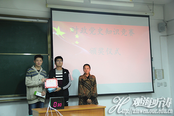 本站讯 10月27日晚,由海洋地球科学学院(以下简称“地院”)团委主办,地院本科生党支部、学生会研究会联合承办的时政党史知识竞赛初赛在教学区举办。本次知识竞赛旨在促进学生们对于时政新闻和党史知识的了解,增强学生们关心家国大事的意识。本科生党支部邵锡惠、学生会副主席张奇和地院辩论队领队杨雨桐担任本次竞赛的评委。最终2016级勘查技术与工程臧虎临、崔峰源组成的第一小组获得了比赛的第一名。
