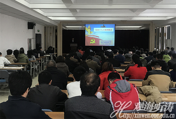 本站讯 为切实学懂、弄通、做实党的十九大精神,迅速在学院掀起学习十九大精神热潮,11月16日下午,工程学院党委在工程学院举办学习贯彻十九大精神专题报告会,邀请中共青岛市委党校副教授、政治学教研部副主任王存福老师为学院师生员工做“党的十九大精神解读”辅导报告,学院全体教职工及学生代表参加会议,会议由工程学院党委副书记于静主持。