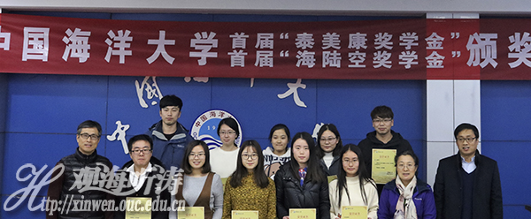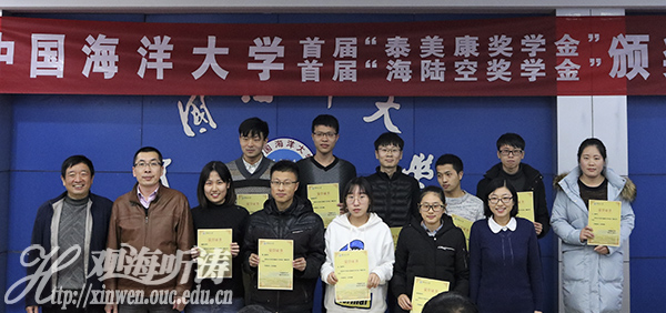 本站讯 12月21日下午,中国海洋大学首届泰美康奖学金、首届海陆空奖学金颁奖仪式在化学化工学院举行。中国海洋大学党委常委、校长助理吴强明,青岛泰美康医疗科技有限公司总经理张晓彬,青岛海陆空环境自控工程有限公司总经理丁润田,及中国海洋大学校友会、教育基金会、研究生院负责人出席了颁奖仪式。