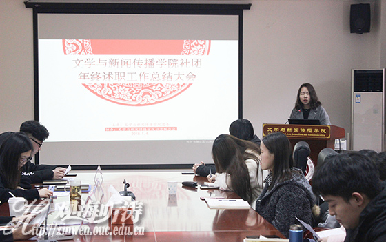 本站讯 1月4日下午,文学与新闻传播学院(以下简称文新学院)首届社团年终述职工作总结大会在文新楼召开。文新学院党委副书记、副院长席静,团委老师闫学聪、张逸如、宿懿、李鹏飞及文新社团联合会(以下简称文新社联)主席王玉琨,海墨汉文化研究协会、国学社等十个社团负责人参加了本次总结大会。
