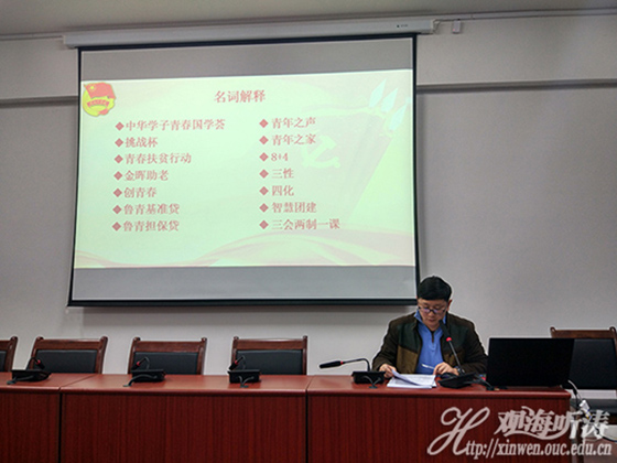 会议伊始,陈昌昀老师带领全体学员学习了共青团山东省第十四次代表大会等相关文件精神,分享了山东省委书记刘家义在共青团山东省第十四次代表大会以及在山东省全面展开新旧动能转换重大工程动员大会上的讲话精神,解读了山东省第十四次团代会报告的内容,剖析了与青年学生学习、实践密切相关的名词,鼓励学生干部坚定理想信念,弘扬时代精神风尚,积极投身创新创业。