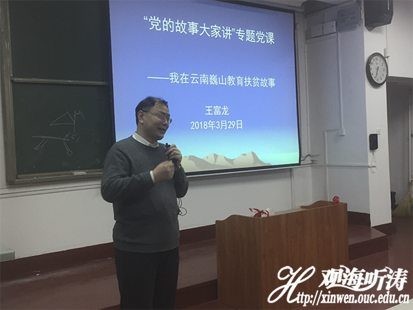 王富龙结合他在云南巍山县挂职期间的教育扶贫经历为在坐的党员和入党积极分子展示了作为一名党员,应该如何工作、如何学习、如何自我严格要求。他从巍山县的基本情况讲起,向同学们展示在巍山挂职副县长期间,在教育帮扶和扶贫工作上所做的工作,当同学们看到当地简陋的校舍、孩子们拥挤的宿舍、四处漏风的家时,深受触动,也深感扶贫攻坚工作的难度和重要性。王富龙用生动的故事、扎实的工作、充满感情的语言,为同学们展示了一个基层的党员干部到底是如何全心全意为人民服务,如何为全面脱贫做出努力的。同时,他也多次提到,在一年多的挂职工作中,学校和学院成为了他的坚实后盾和依靠,在学院和学校的帮助下,他从教育部争取到对巍山的90万对口援助资金;他帮助巍山小吃走出当地,进驻海大校园;在巍山召开红雪梨产业研讨会,请到梨产业国内领军人物为巍山的红雪梨产业出谋划策等,在学校和学院的支持中,他圆满完成了为期一年的巍山挂职任务。