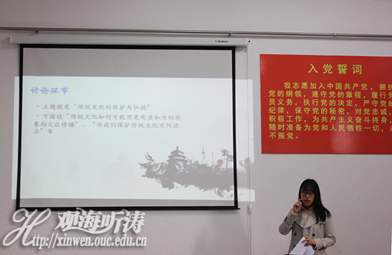 最后的讨论环节中,大家围绕“传统文化如何才能用更有亲和力的形象向大众传播”以及“为我们保护传统文化有何启示”这两个话题进行讨论。2017级新闻传播学类的张耀文同学率先发言,她提到,我们作为传承者,应学会用大众喜闻乐见的方式传播传统文化,并以《朗读者》、《见字如面》为例,指出综艺节目对传统文化的传播作用。2017级汉语言文学专业的王金亮同学则认为传统文化的传播不应该仅仅局限于大众传媒,高级知识分子应当承担更大的责任;应该将传统文化分散化,让其他学科充分汲取传统文化的营养,达到传统文化的深层次发扬。赵雪怡同学提出,传统文化的保护一定要有一定的物质条件,放慢城市文化的更新,更好的保护传统文化。最后是唐慧婷同学,她认为一方面对于传统文化的现存记忆不要消失殆尽,另一方面要尝试复原古代的传统文化记忆。