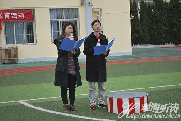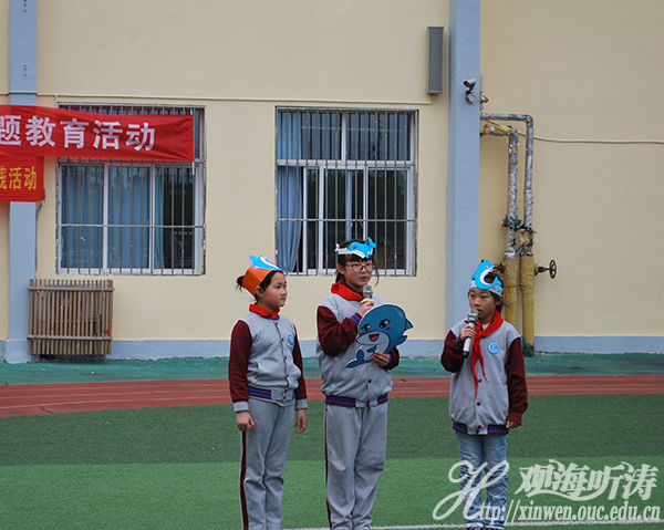 活动当天,义工队员带领一到六年级的小学生在操场上一起热身暖场,一段可爱的海豚舞过后,孩子们和义工队员的距离拉近,欢笑声洒满操场。随后,孩子们登台表演以“保护海洋,保护海豚”为主题的节目,表达了他们对保护海洋,保护动物的理解。表演结束后,义工队员向孩子们作了关于“保护海洋、保护动物”的主题演讲,孩子们听得聚精会神,眼睛里装满了对知识的好奇与渴望。随后,八大峡小学的校长对中国海洋大学“勉行”义工队的志愿服务表示感谢,活泼可爱的孩子们给义工们亲切地戴上了红领巾。