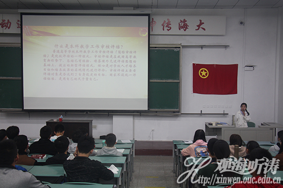 本次主题团日活动从雄壮的《光荣啊,中国共青团》中拉开序幕。全体团员佩戴团徽,面向团旗高唱团歌,高昂而激扬的声音回荡在每位团员的耳畔。宣誓环节由材料学院团委副书记张蔚圣老师领誓,团员们面对团旗,高举右拳,重温了入团誓词,再次接受了一次思想洗礼,增强了团员意识。接下来,材料学院辅导员郭纪斐老师为参会的团员代表进行了迎接本科教学工作审核评估的专题辅导。本次专题辅导重申了本科教学工作审核评估的内涵,点明了本次审核评估对学校、对同学们未来发展的重大意义,强调了课堂纪律、宿舍卫生、文明礼仪等需要重点注意的问题,并希望参会的团小组组长将本次的会议精神传达到团小组内的每位团员,让团员青年牢牢树立起海大主人翁的意识,认真学习审核评估相关知识,充分意识到自己一言一行、一举一动都代表着海大最真实的形象。