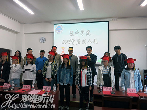 本站讯 5月3日下午,由中国海洋大学经济学院党委、团委主办,中国海洋大学经济学院社团联合会承办的经济学院首届成人礼在经济学院举办。出席本次活动的嘉宾有:经济学院副院长、党委青年委员纪建悦教授,经济学院副教授王舒鸿老师,经济学院团委书记蓝雷波老师,经济学院团委副书记陈昌昀老师、宋平平老师,韩胜好老师,经济学院团委委员贾桓宇、刘晓莉、吴梓泓。