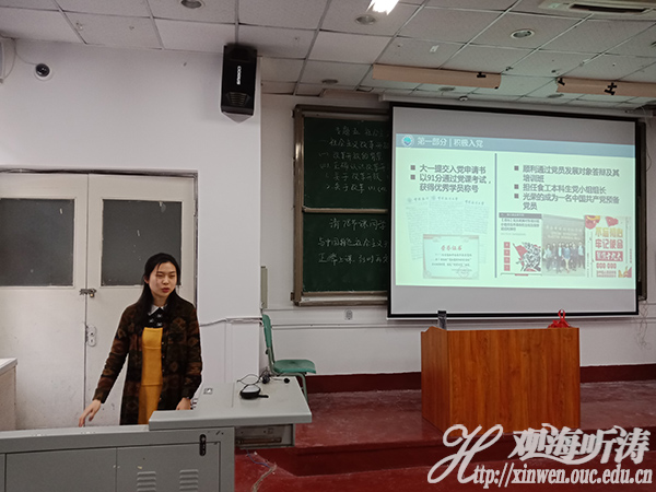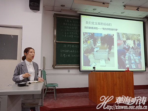 之后由2015级食品科学与工程宿文凡讲述个人的入党经历。宿文凡从自己递交入党申请书开始讲起,谈到党课考试、发展答辩以及担任团支书、党小组组长的经历,展现作为一名共产党员的带头作用。随后由2015级食品科学与工程井玉洁结合自己的学生会工作同大家分享个人的入党动机,通过回顾自己的成长经历,由干事到部长再到主席,一步步地为学生会和学院同学服务。第四位由2016级食品科学与工程宝瑞雅为大家介绍党支部的相关活动,如“我为学院做件事”、参观郭永怀纪念馆、党的故事大家讲等。其中着重讲了上期由林洪教授做的黄大年式教师团队分享,让大家了解到我们身边的教师党员为了科研和学院发展兢兢业业地工作。