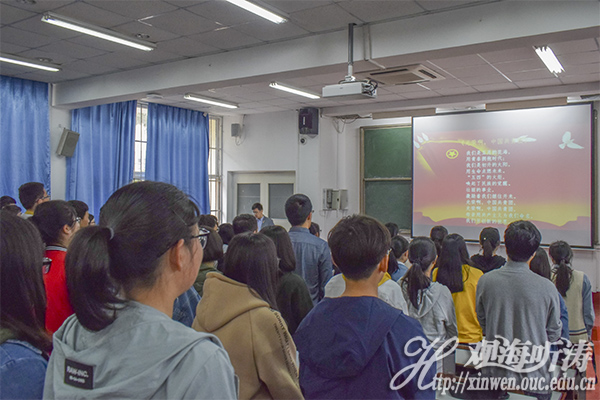 活动伊始,秦瑾晖直入主题,为同学们讲解了此次会议的流程。随后进行会议第一项,全体起立,奏唱国歌——《义勇军进行曲》,为活动的展开渲染庄重严肃的氛围。会议第二项,秦瑾晖宣布中国海洋大学2017年度先进个人及先进集体获奖名单 ,其中包括优秀团员、优秀团干部、先进青年志愿者等奖项。随后,其中四位优秀代表上台发言。首先发言的是优秀团员代表郭华(2016级药学一班),他主要总结了自己在思想上、学习上取得的进步,以及同大家分享自己的经验与收获。而后发言的是优秀团干部代表俞蕴嘉(2016级药物化学硕士),她告诉大家,青年人正值最美好的年华,正是努力学习、丰富自我和报效国家的时候,应当肩负起时代赋予的光荣使命。之后,优秀青年志愿者代表张京星(2016级制药工程硕士)向大家介绍其参与的“关爱罕见病患者”志愿服务活动的情况以及自身的体会、收获。随后,团员先锋代表曾薪屹(2016级药学二班)就其在学习先锋岗的学习工作进行了发言,并表示希望今后能更好地服务同学。