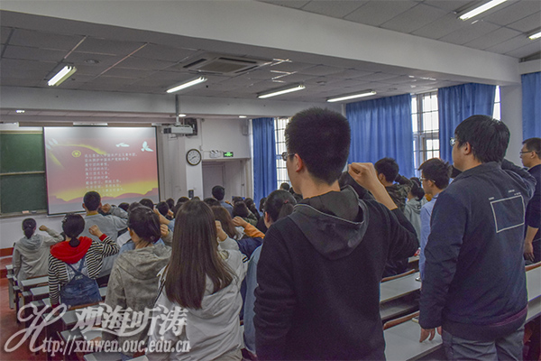 活动第三项,由高缘带领大家重温入团仪式,同学们在佩戴团徽后,进行庄严宣誓。活动第四项,由团委书记王小峰讲话,她指出要做有理想的青年,做有作为的团员,就必须严格要求自身,肩负起作为团员的责任。随后秦瑾晖宣读五四系列活动的工作安排,并总结本次会议内容。随着会议接近尾声,同学们也对一名团员如何发挥先锋模范作用有了更加深刻的认识。活动最后,全体奏唱团歌——《光荣啊,中国共青团》,此次会议也画上圆满的句号。