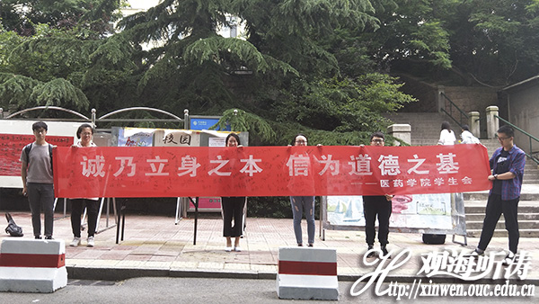 本站讯 6月7日中午,由医药学院团委主办,医药学院学生会承办的“诚信,道德”横幅签字活动于鱼山校区学苑餐厅对面开展。在此之前,医药学院各年级已经召开有关诚信的主题班会。本次活动旨在使同学们更充分了解诚信内涵,深刻明确诚信对当代大学生的重要性,同时弘扬诚实守信道德品质。