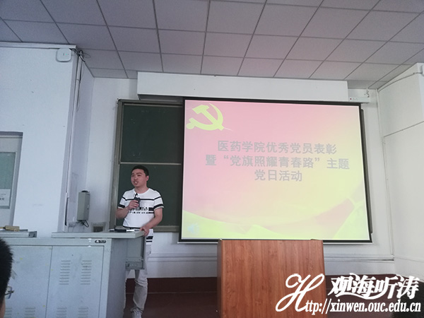本站讯 为激励表彰优秀党员,丰富学生党员组织生活,医药学院于6月14日下午在新教学楼举办2017年度“医药学院优秀共产党员”表彰大会暨“党旗照耀青春路”主题党日活动。医药学院团委书记王小峰、辅导员高缘及医药学院全体党员出席并参加本次活动。