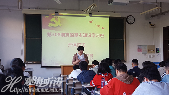 本站讯 9月27日下午,中国海洋大学第308期党的基本知识学习班开班仪式在教学区举行。工程学院党委副书记于静、团委书记钟媛、第302期党课优秀学员代表以及本期党课学员出席了仪式。仪式由学院党建辅导员李碧依主持。