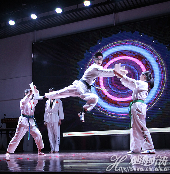人言落日即是天涯,望极天涯不见家,对你的思念渐成烟缕,耳畔仍是那温柔叮咛。离家行至远方,不舍家中父母,《思绪》的歌声将对家的深情化作溪流,趟进心田。《令仪》舞者舞动手中一席扇子,似仙子般步步点在舞台上,绽放朵朵青莲。轻高曼舞,一颦一笑动人心弦,使人眼中净是古典女子的绝代风华。情景剧《海大初尝试》将新生的曲折心路惟妙惟肖演绎出来,宿舍,社团,新奇的一切都让刚刚来到的少年们好奇无比,心领神会的观众哑然失笑。金黄铺满视野,曼妙舞姿彰显着印度特有的气息,《快乐的跳吧》中,3位女子舞的令人迷醉,变化莫测的舞姿竟如同诗歌般的优美。干练的动作透露着青春的气息,跆拳道协会的成员登台表演,闪电般的腿影中隐约闪烁着少年们的英姿飒爽。
