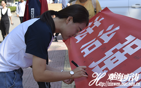9月27日上午,在鱼山校区学苑餐厅门口,学生会成员展开写有“法治兴则国兴 法治强则国强”十二个大字的横幅,吸引许多同学驻足围观。听完对“学宪法,讲宪法"签名活动的介绍后,同学们在横幅上认真地签上自己的名字。在横幅上签名,这看似微小的举动,实际上是在庄严承诺,承诺自己将严格遵守宪法,支持法治。此次活动除同学们积极参加、踊跃签名外,还引起几位领导和老师的关注。他们亦郑重地在横幅上签下自己的名字,以示对本活动的认可和支持。