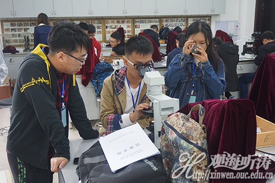 开幕式过后,紧张刺激的地质技能及地学知识竞赛决赛正式开始,选手们开始进行标本鉴定工作。选手们虽然顺利通过了前期的地学知识竞赛,但他们仍不敢懈怠,在正式进入比赛教室之前,仍在紧张地翻阅笔记和资料。参赛选手每三人一组,分工明确、相互配合、积极讨论,形成了良好的竞赛氛围。专业组的选手们在偏光显微镜实验室和岩石实验室进行对标本的精准鉴定,非专业组的选手们在普通地质实验室对矿物岩石手标本进行类型判别和特征描述。虽然任务各不相同,但是选手们认真专注的态度却是一致的。