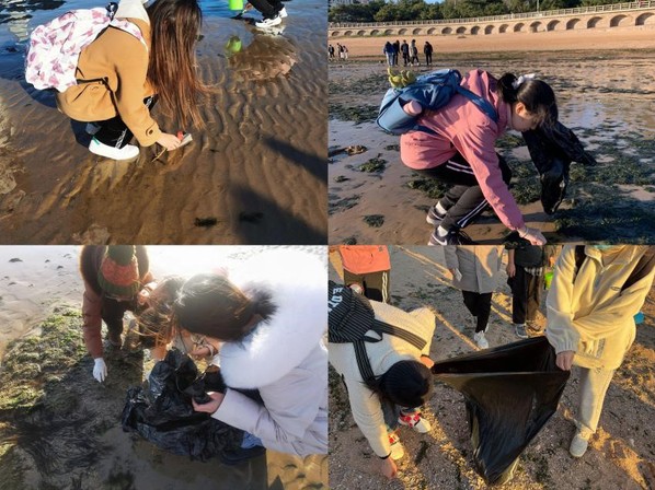 太平角公园是青岛著名旅游景区,人类活动对于其中海洋生物的影响尤其明显。在本次实践过程中,同学们发现有许多垃圾滞留在海滩上或是缠绕在一些海洋生物身上,这不仅破坏了海洋生物的栖息地,对海洋生物的生存也产生了威胁。为加快建设“水清、滩净、岸绿、湾美、岛靓”的美丽海洋,彰显环科学子的环保意识,2019级环境科学本科班开展海边净滩志愿活动,“拉网式”清理游客带来的垃圾,为我国海洋建设和环境保护做出自己的贡献。