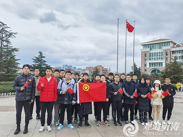 入党积极分子参加学校纪念“一二·九”运动升旗仪式,在场同学庄严肃立,向国旗行注目礼并唱国歌。在同学们的注目中,五星红旗冉冉升起,迎风飘扬。