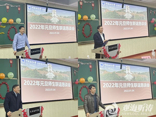 本站讯 为增进学员友谊,通过联谊促合作,通过合作促发展,1月4日,未来海洋学院元旦师生联谊恳谈会举办。会议由未来海洋学院副院长甘波澜主持,研究生院培养办公室主任刘海波、未来海洋学院院长李建平、副院长马崑,授课教师代表李三忠、刘永江、张志伟等教授,导师代表庄光超教授,以及未来海洋学院第一至三期学员参加。