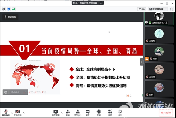 主题班会上,各辅导员首先通报了当前青岛疫情的整体形势,对学校疫情防控规定做了详细的阐释,明确了校园封控管理下学生的行为规范,并结合具体案例明确了违纪行为的处理办法,同时呼吁同学们自觉遵守学校防疫政策和管理规定,保持良好的心态,共同努力打赢这场“战疫”。