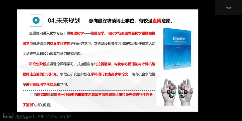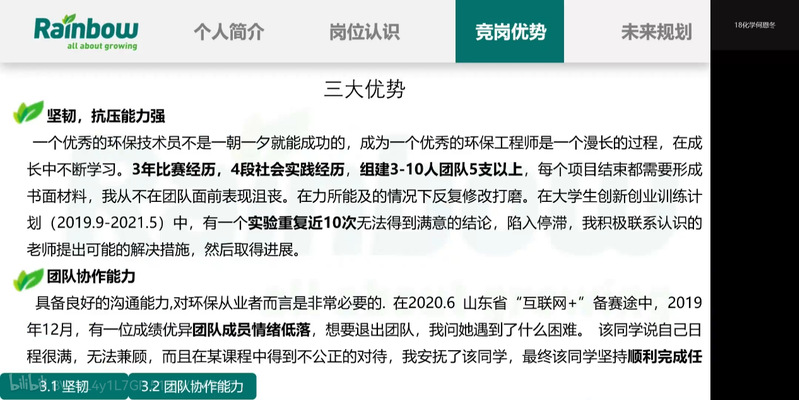 活动包含初赛选拔、线上决赛答辩、投票评选、评委指导分享四个环节。比赛分为两个赛道,赛道1为模拟保研夏令营/考研复试个人陈述PPT的升学模块,仅限本科生参加;赛道2为模拟润丰公司招聘对应岗位制作个人陈述PPT的就业模块,本科生与研究生分组进行评选。此次活动收到来自本院不同年级的42份PPT,决赛有十名不同赛道选手进行陈述分享,评选出特等奖三名、一等奖七名。润丰股份专属招聘官郝明青先生指出,一份求职报告想要脱颖而出必须通过一些小亮点拉近距离,对于HR而言,求职者是否适合这项工作更为重要;化学化工学院副教授别海燕老师强调了PPT设计的完整性与逻辑性,以及制作之前内容准备的重要性;学院团委书记吕朋老师指出“细节决定成败”,细微的差池也能造成很大的影响。