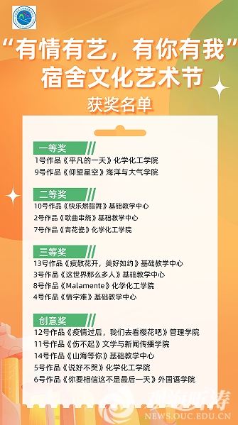 活动以学生宿舍为阵地,激发“舍”员的才艺展示热情,以多种艺术形式的短视频为载体,开展系列才艺展演活动,呈现出了别具特色的美育课堂。活动共有来自8个学院的学生投稿参与,最终有14组优秀作品脱颖而出,成为本次“有情有艺,有你有我”宿舍文化艺术节的优秀作品并参与线上云展播。获奖作品题材丰富,包括声乐、器乐、舞蹈、健身、手工、美术、摄影等多种艺术形式,同学们通过视频记录下了疫情期间专注学习、健康快乐、理解他人、关心社会的海大学子们,同学们用艺术作品,坚定抗疫信心、传递抗疫真情。
