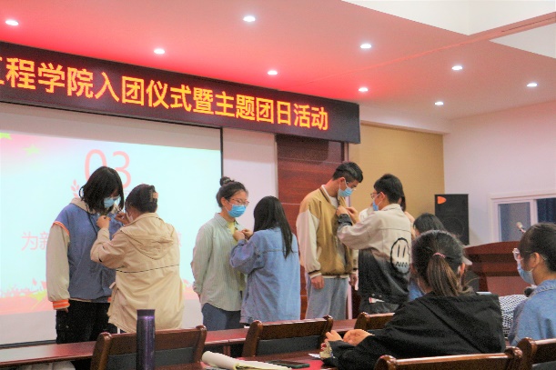 随后,王宁宁宣读2021年新发展团员名单,并与优秀团员代表一起为新团员佩戴团徽。崭新的团徽象征着成为一名团员的光荣,新发展团员接过了共产主义的接力棒,也被寄予了新时代的期望。