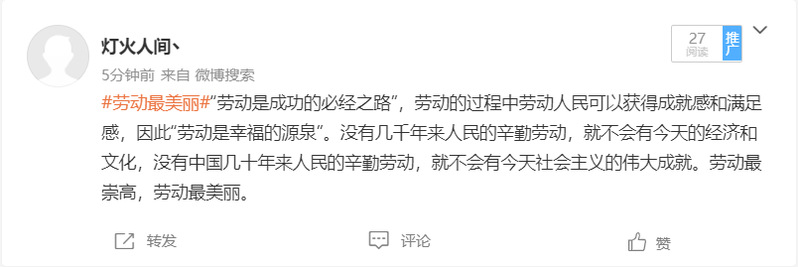 同学们在接受劳动教育、积极参与劳动实践的同时,也积极将自己的所学所感进行分享。“光荣属于劳动者”、“劳动最美丽”、“劳动最崇高”是同学们投身劳动后最真实而炽热的言语。只有通过辛勤劳动、诚实劳动、创造性劳动,梦想的阳光才会照进现实,实现中华民族伟大复兴,需要全国亿万劳动者继续付出辛勤努力。期望广大新时代青年们继续用咬定青山不放松的干劲、不达目的不罢休的闯劲、越是艰险越向前的钻劲积极投身于我们的伟大事业中,积极贡献青春力量。