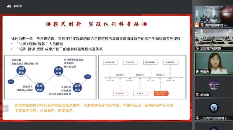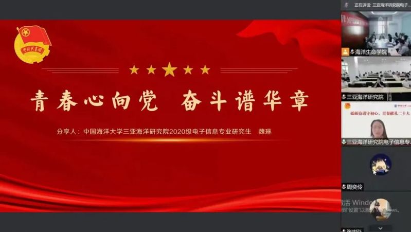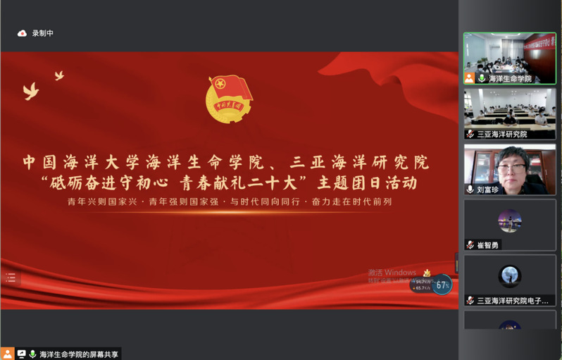本站讯 为引导广大团员青年认真学习贯彻习近平总书记在中国海洋大学三亚海洋研究院考察重要讲话精神,鼓足信心,斗志昂扬,奋进新征程,建功新时代,5月5日下午,中国海洋大学海洋生命学院联合三亚海洋研究院,在青岛、三亚两地分设会场,以线上、线下相结合的方式举办“砥砺奋进守初心 青春献礼二十大”主题团日活动。中国共产主义青年团青岛市团校常务副校长刘富珍,中国海洋大学海洋生命学院党委副书记、副院长张晓燕,团委书记伍玥琪,三亚海洋研究院辅导员王小敏出席本次活动。活动由海洋生命学院团委专职团干部张文博主持。