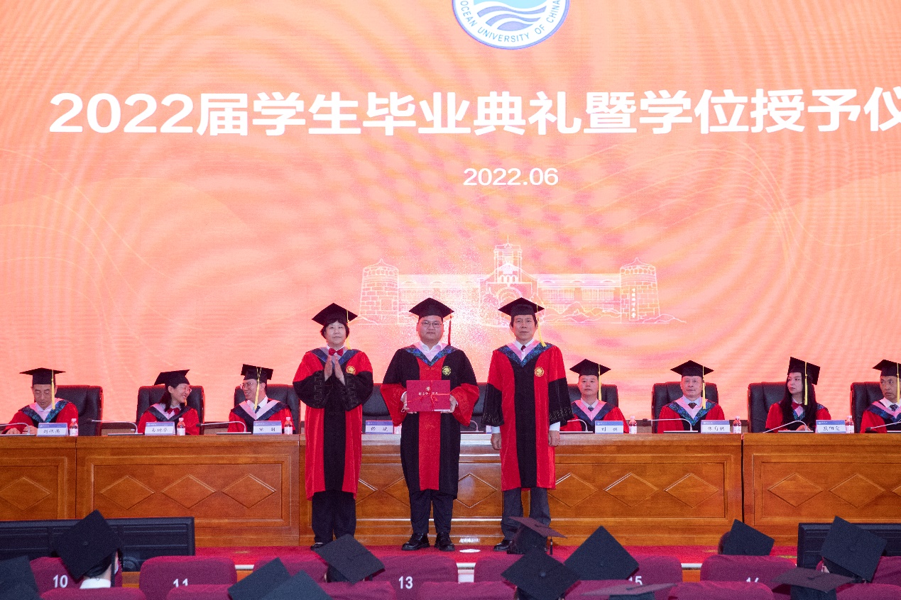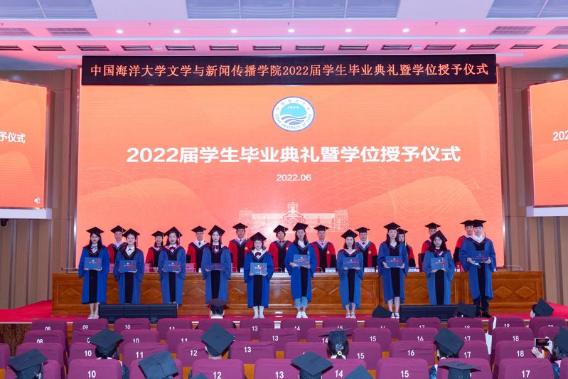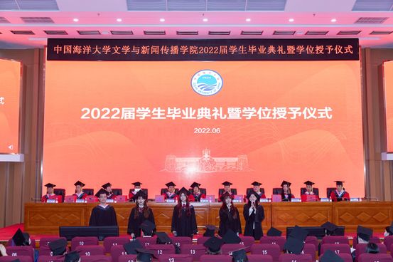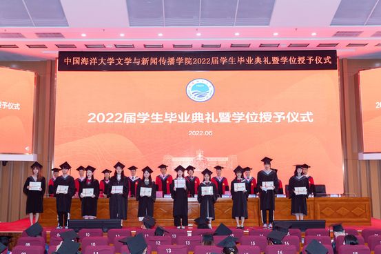 本站讯 6月15日上午,文学与新闻传播学院2022届学生毕业典礼暨学位授予仪式在海洋科技楼国际报告厅成功举行。中国海洋大学党委常务副书记张静,文学与新闻传播学院党委书记刘健,文学与新闻传播学院学位评定委员分会主席、院长修斌,副主席朱自强,委员赵成国、韦春喜、熊明、欧阳霞、马树华、刘怀荣、刘中富出席典礼及仪式,并为参加毕业典礼的1名博士毕业生、104名硕士毕业生、220名本科毕业生和1名国际留学生毕业生,拨穗正冠,并颁发毕业证书。毕业典礼由学院党委副书记吉晓莉主持,研究生授位仪式和本科生授位仪式分别由副院长韦春喜、赵成国主持。