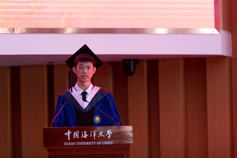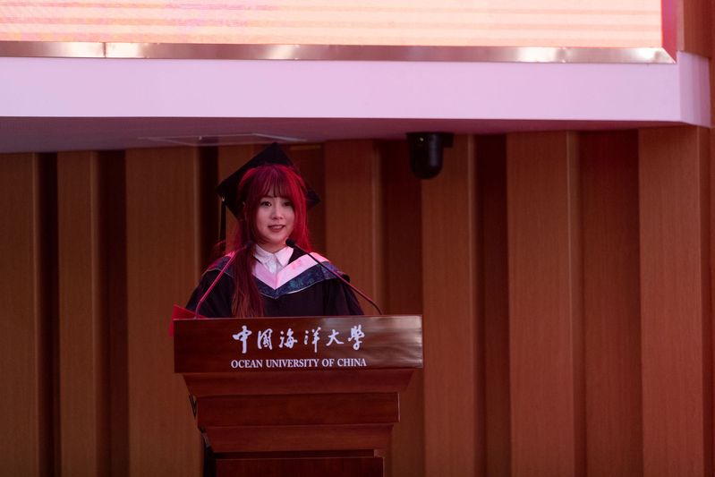 山东省优秀学生、文苑奖学金、优秀学生标兵获得者,2018级新闻学专业本科生王江珹作为本科毕业生代表发言。她回顾了四年海大生活,表达了对母校的惜别、感激之情,并号召全体毕业生坚定的走向未来,在天南海北,再次谱写海大人的蓝色华章。