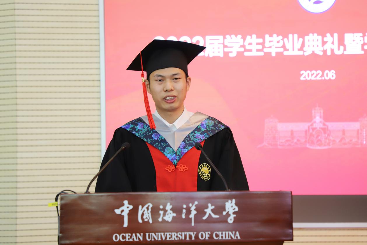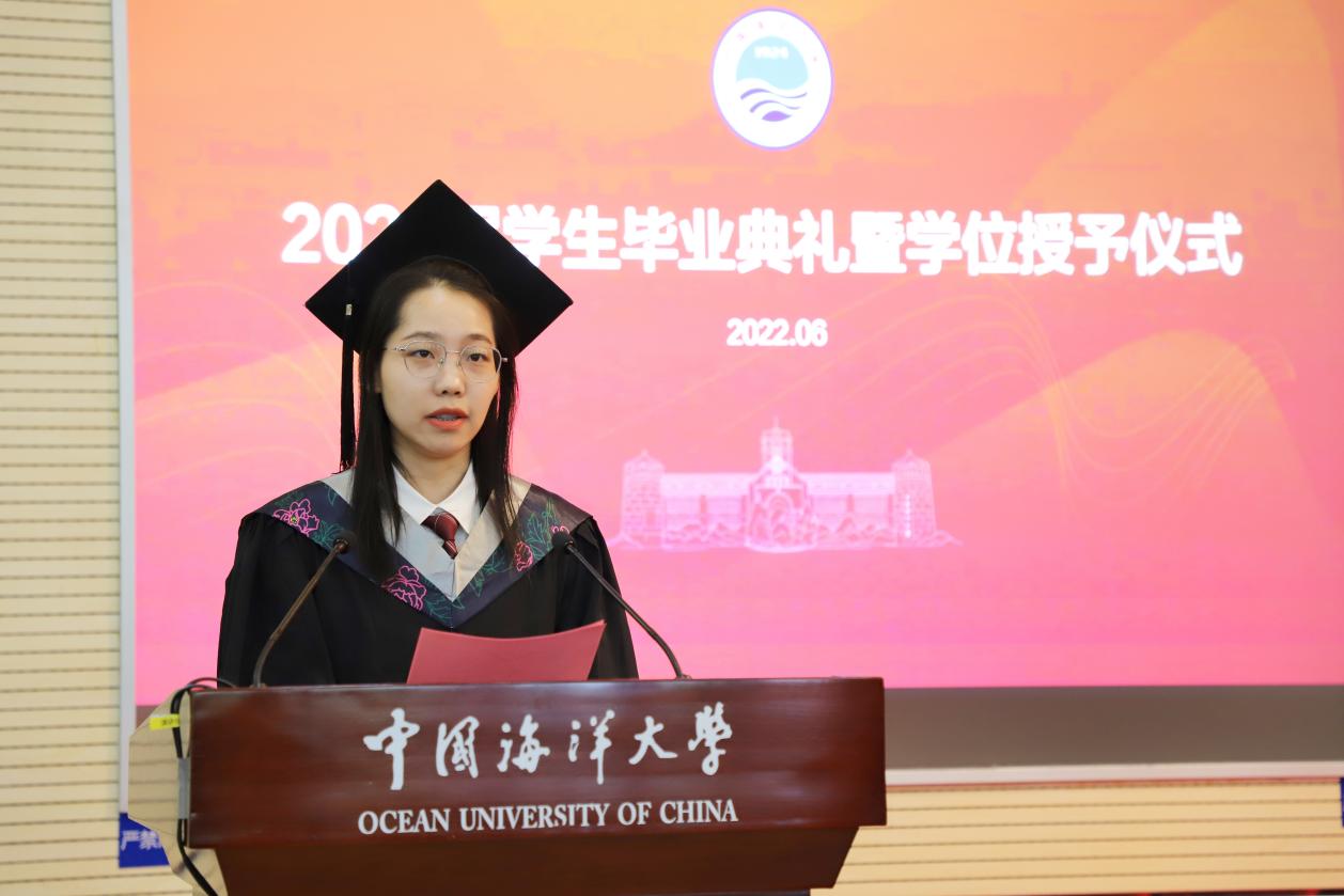 毕业典礼在雄壮的国歌声中拉开帷幕。仪式上,王剑敏宣读了《中国海洋大学学位评定委员会关于授予博士学位、硕士学位和学士学位的决定》,并为荣誉学士学位获得者张鑫悦颁奖。