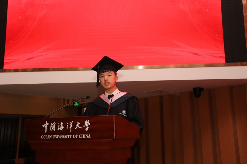随后,2018级法学1班薛照融同学作为毕业生代表发言。在发言中,他表达了对母校的感谢,向大家诉说了在法学院四年学习生活中的收获。接着,他从“强竞争的时代”“后疫情的时代”“信息流的时代”三个角度,表达了法律人不能仅局限于法律,还应拓宽视野,将个人融入时代的洪流,心怀法治信仰,浩海求索是,谋海济国功。