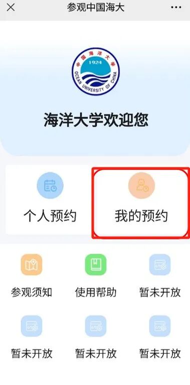 2.在公众号菜单栏点击“参观预约”(或“参观中国海大”)模块,进入“个人预约”。