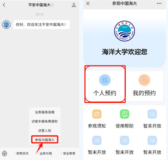 *如果您关注的是“平安中国海大”公众号,可在“业务办理”中查找到“参观中国海大”。