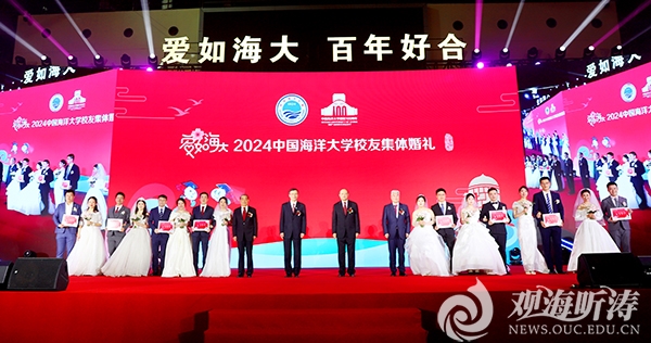 中国海洋大学校长张峻峰,原党委书记、校友会名誉会长冯瑞龙,原校长、校友会名誉会长吴德星,原校长、校友会会长于志刚出席典礼,并为新人们颁发纪念婚书。