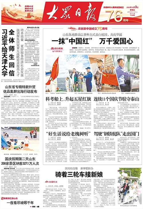 【编者按】家国同心,共庆华诞。在新中国成立76周年之际,《大众日报》联合山东16市党报推出“假日观察·省市党报联动”融媒报道。10月3日出版的《大众日报》头版,以“科考船上,升起五星红旗”为题,对中国海洋大学“东方红3”船工作人员立足岗位,扎实开展科学考察,以及举办升旗仪式等系列活动欢度国庆、祝福祖国的家国情怀进行了重点报道。