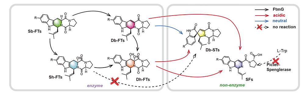 天然产物一直以来都是药物的重要来源,吲哚生物碱因其多样的结构和广泛的生物活性(如抗菌、抗肿瘤、抗病毒等)而备受关注。其中,β-carboline(βCs)和spirotryprostatins(STs)两类天然吲哚分子的生物合成途径研究相对较少。βCs只有3种Pictet–Spengler骨架形成酶有报道,同时STs仅知FqzB/FtmG与螺环形成有关且部分假说缺乏实验佐证,而且pH等环境因子如何驱动其结构多样性亦未阐明。