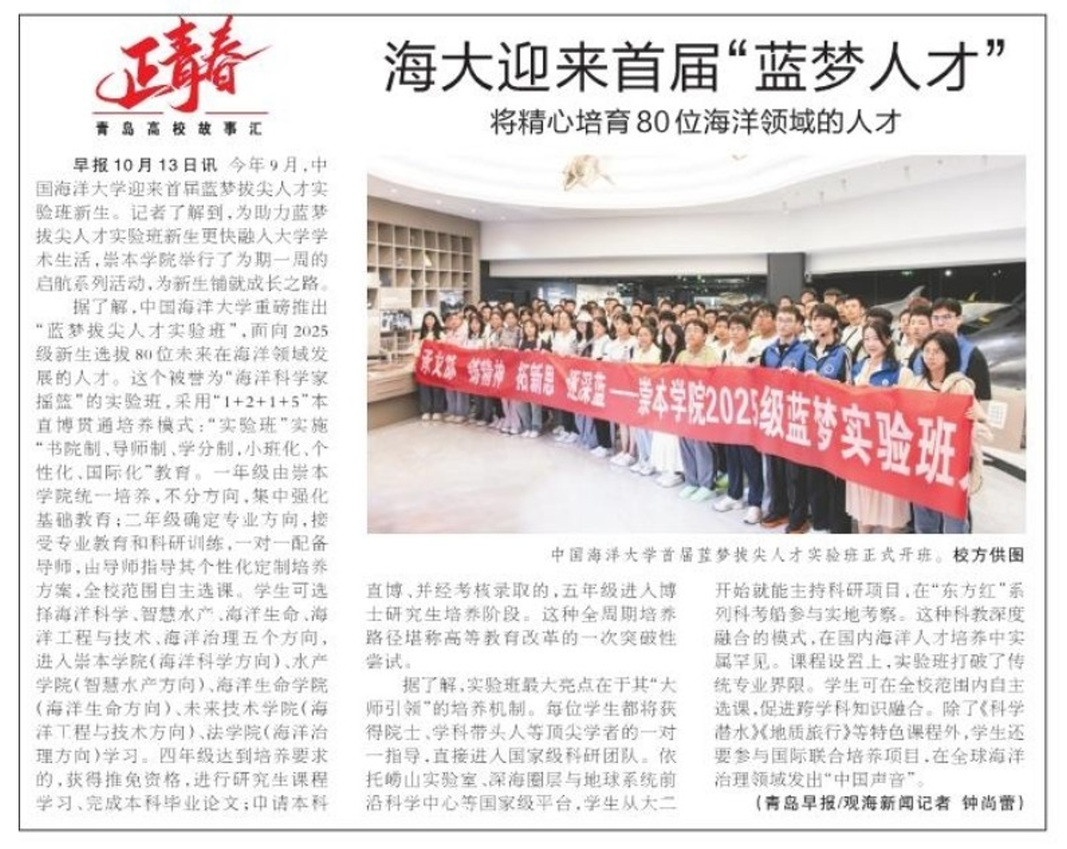 新闻来源:2025年10月14日【青岛早报】海大迎来首届“蓝梦人才”